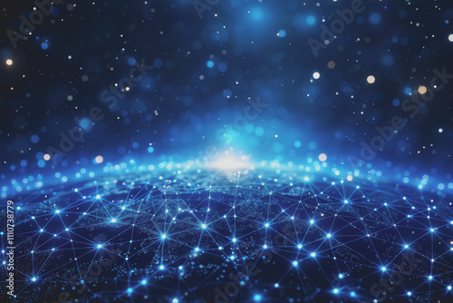 Abstract digital background with a blue gradient and glowing planets with connecting dots.