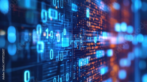 abstract, digital, binary, code, datum, technology, cyberspace, network, future, futuristic, science, innovation, information, communication, progress, evolution, development, concept, design, background, texture, pattern, modern, style, graphic, illustration, three-dimensional, rendering, blue, orange, light, glow, bright