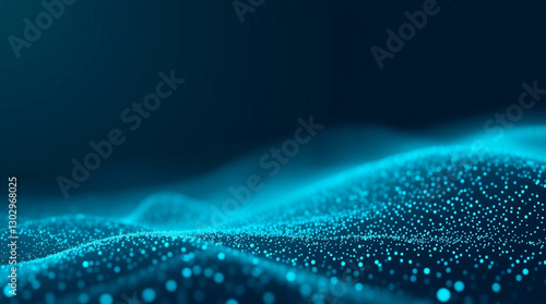 Abstract digital background with glowing teal particles forming a smooth, wave-like texture. Ideal for futuristic, technological, and creative design projects with a dynamic and energetic vibe.