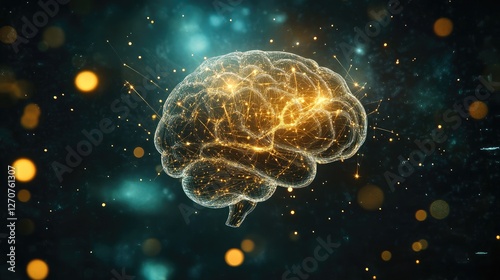 Abstract digital brain with golden particles and pulsating neural connections, set against a dark sci-fi background