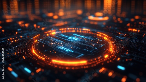 Abstract digital circuitry with glowing orange and blue elements.