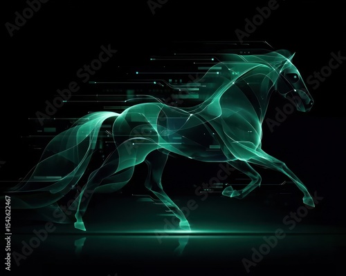 abstract, digital, horse, futuristic, design, green, outline, silhouette, speed, motion, technology, line, dynamic, energy, glow, light, black, background, elegant