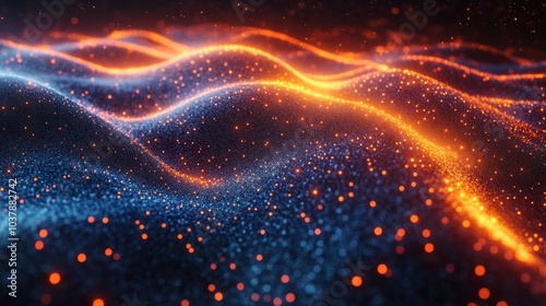 abstract, digital, artificial intelligence, ai, technology, futuristic, wave, particle, orange, blue, glowing, innovation, computing, tech, pattern, background, dot, energy, light, modern, information, network, virtual, cyber, space, visual, science fiction, intelligence, neural, electronic, digital artwork, complexity, connection, future, flow, circuit, visualisation, development