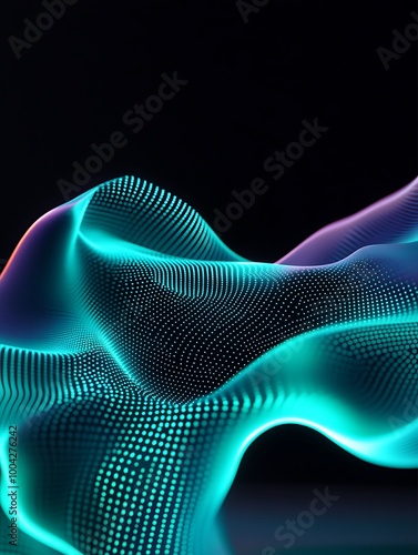 Abstract digital wave pattern in vibrant colors on a black background. A minimalist poster in metallic and chrome gradient style.