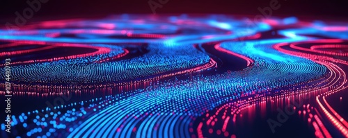 Abstract digital wave with vibrant blue and red lines on dark background.