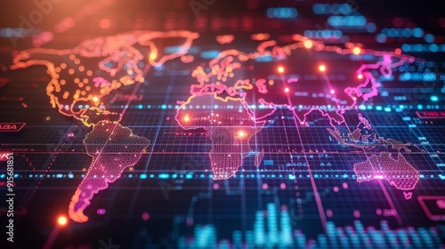 Abstract digital world map with glowing connections and data points, representing global communication, technology, and data network.