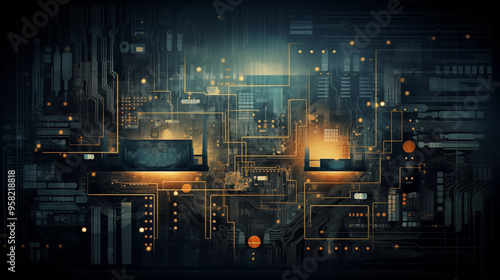 Abstract electrical circuits with gold printed lines, Abstract realms of digital data, illuminated by technological light, form a fractal pattern in the boundless cyberspace
