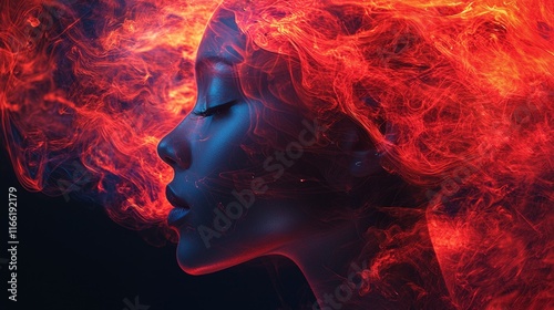 woman, profile, fiery, red, abstract, dramatic, artistic, bold, vibrant, unique, striking, modern, creative, aesthetic, colourful, dynamic, atmospheric, bright, stunning, expressive