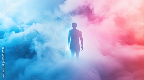 abstract, figure, standing, tall, swirling, cloud, blue, red, colours, atmosphere, silhouette, depth, contrast, visual, representation, mysterious, concept, creativity, art, scene, dramatic, emotion, human, freedom, nature, surreal, journey, exploration, beauty, imagination, solitude, fantasy, perspective, dream, elegance, inspiration, wonder, soft, aglow, highlight, outline, design, minimalism, calm, tranquil, aethereal, essence, mystique