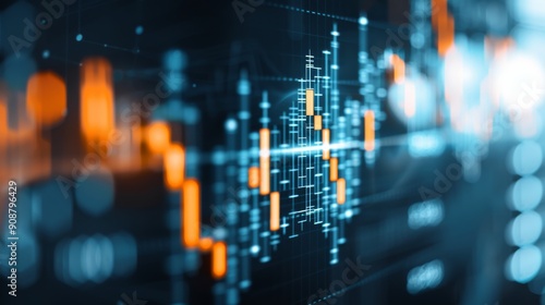 Abstract financial data visualization with glowing lines and bars representing stock market trends and fluctuations.