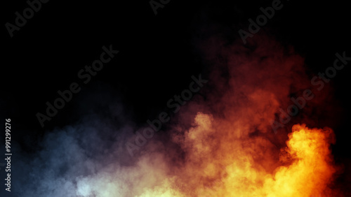 Abstract fire and blue smoke misty fog on isolated black background. Texture overlays. Design element.