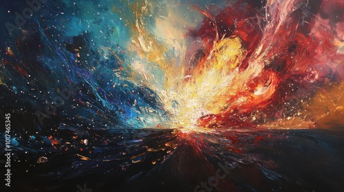 abstract, fire, water, sky, painting, art, artwork, canvas, colours, explosion, flames, galaxy, horizon, landscape, night, ocean, star, sun, texture, high-coloured, bright, dynamic, energy, intense, movement, powerful, bold, contrast, impact, dramatic, creative, imagination, expression, fantasy, modern, style, unique, impressionism, expressionism