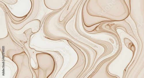 Abstract flowing pattern of creamy brown and white liquid ink creating organic shapes and fluid motion.