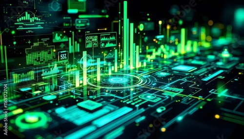 Abstract Futuristic Circuit Board with Glowing Elements and Data Visualization