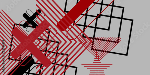 Abstract geometric background with red and black diagonal lines and shapes.
