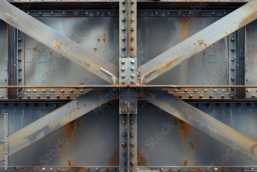 Abstract geometric composition of industrial steel beam framework with repeating lines and angles providing a dynamic architectural background with engineering focus old rusty metal door