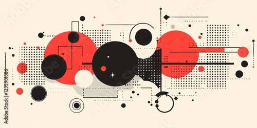 abstract, geometric, composition, circle, rectangle, dot, pattern, red, black, white, modern, art, design, illustration, graphic, shape, line, decorative, contemporary, background, element, creative, style, texture, form, concept, surface, simple, flat, decor, poster, drawing, artwork, banner, presentation, wallpaper, layout, template, print, modernism, retro