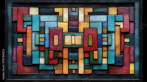 abstract, geometric, leather, artwork, colourful, rectangular, design, shape, pattern, texture, art, collage, mosaic, modern, contemporary, style, vibrant, hue, shades, tone, colours, block, square, rectangle, line, composition, visual, image, background, framed, piece, creation, craft, hand-made, artistry, skilful, detail, intricate, element, palette, rich, depth, contrast