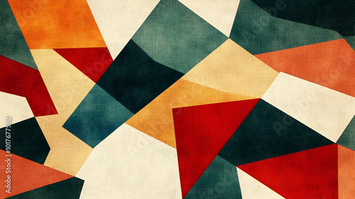 Abstract Geometric Pattern with Red, Orange, Teal, and Beige Shapes on a White Canvas Background
