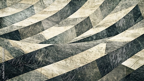 Abstract geometric pattern with textured, grayscale stripes creating a dynamic, wave-like effect. Ideal for backgrounds, design projects & modern art.