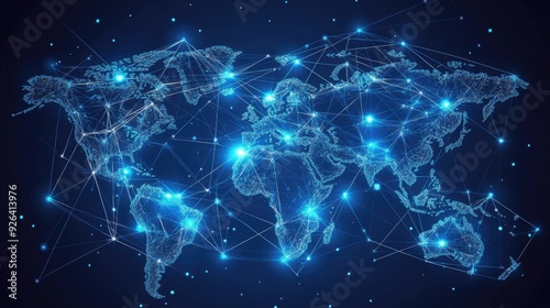 Abstract global business map with interconnected data points and network lines. The vector illustration depicts telecommunication connections across continents.
