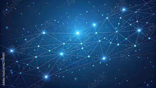 Abstract glowing blue network of interconnected lines and bright points of light on a dark cosmic background representing data and technology