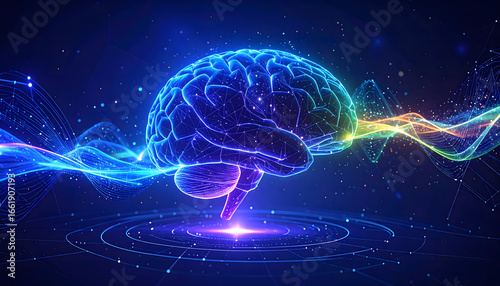 Abstract glowing brain hologram with flowing colorful data streams representing emotional states.