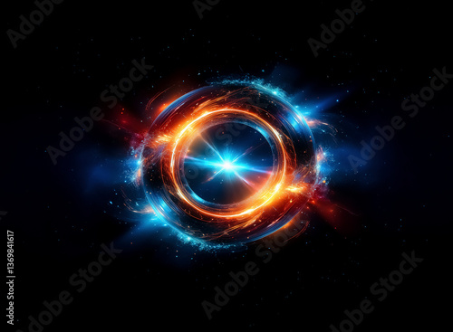 Abstract glowing circular form with vibrant blue and orange hues, emanating light on a dark backdrop. Looks like energy portal or cosmic ring.