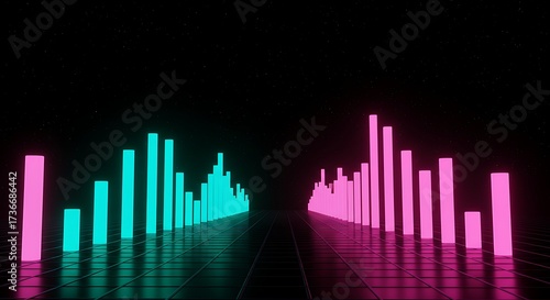 Abstract glowing neon bar graph equalizer in pink and teal on black background