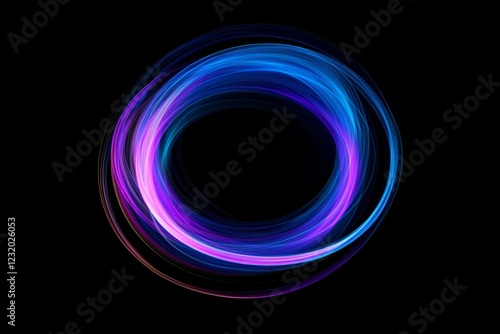 Abstract glowing neon light circle, purple blue swirl on black background.