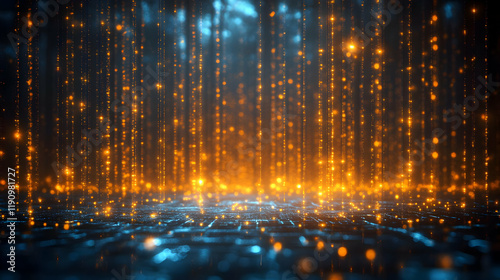 glowing, particle, abstract, background, gold, blue, light, energy, digital, technology, glistering, sparkle, shine, bright, dynamic, motion, futuristic, modern, elegant, luxury, cosmic, stellar, datum, network, connection, flow, stream, rain, cascade, texture, pattern, design, graphic, illustration