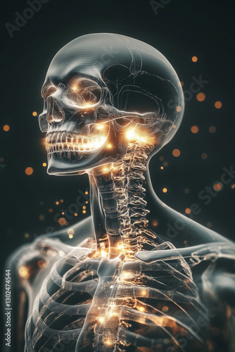 abstract glowing skeleton, x-ray skull, with a high-tech aesthetic, useful for educational materials, tech posters, and fantasy artwork