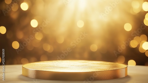 Abstract golden light glitter background with shiny glow, showcasing a luxurious and glamorous stage or podium scene, perfect for award ceremonies, celebrations, or high-end events.