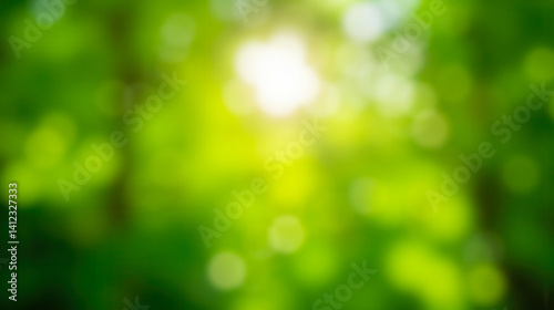 Abstract green defocused forest background with warm sunlight and soft glow bokeh. nature energy and organic design