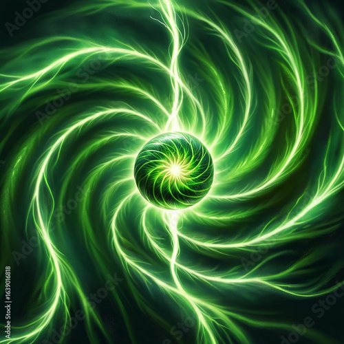 Abstract green energy vortex with glowing orb at the center, radiating powerful light and swirling energy patterns