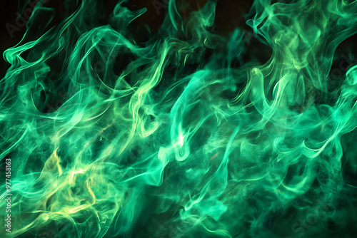 Abstract green smoke swirling in dynamic patterns, creating an ethereal and mystical effect.