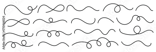 Abstract hand drawn curve. Vector swirl lines. Thin line squiggle wavy shapes. Decorative swirl and elegant divider. Looping squiggle lines pattern or texture.
