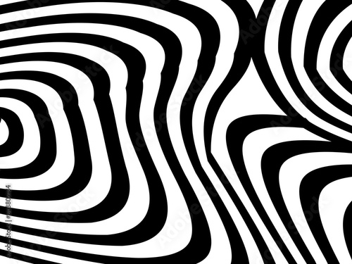 Abstract hypnotic wave pattern with black-and-white striped lines. Psychedelic background. Op art, optical illusion. Modern design, graphic texture.