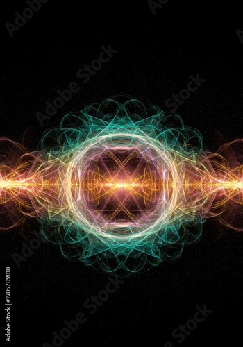 Abstract illustration of energy flow, showing complex resonant wave interference patterns and vibrational fields in a dark background ,digital ,science ,resonance