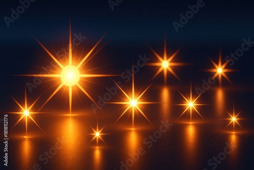 Abstract illustration of glowing sun-like bursts and reflections on a dark surface