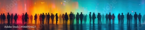Abstract illustration of many people silhouettes standing in front of a blue and green gradient background