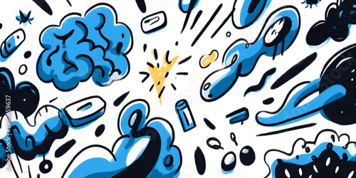Abstract illustration showcasing complex medical science. This doodle art, with its vibrant blue hues, explores the brain and mind, featuring a pill, all representing health and cognitive processes.