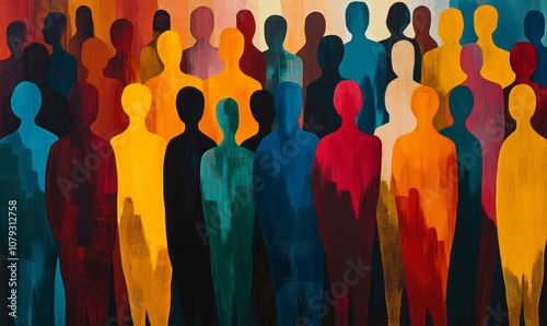 Abstract image of a crowd featuring colorful, stylized human figure silhouettes in various shades arranged closely together