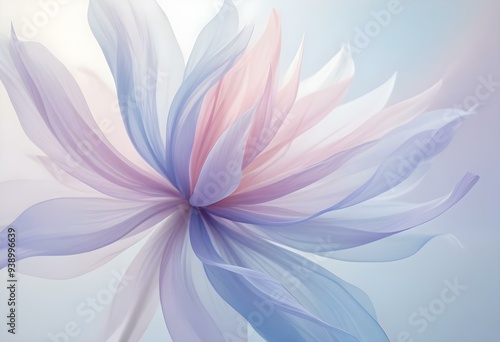 Abstract image of a flower in soft pastel colors, flowing, translucent petals with a blend of light pink, blue, and lavender hues, white background, centered composition