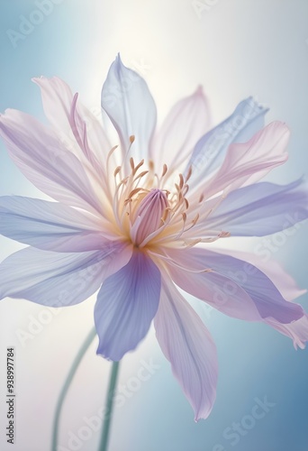 Abstract image of a flower in soft pastel colors, flowing, translucent petals with a blend of light pink, blue, and lavender hues, white background, centered composition