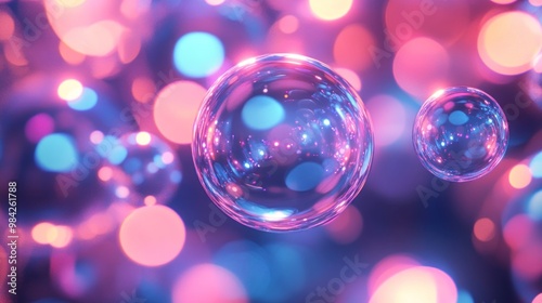 Abstract image of floating transparent glass spheres with colorful bokeh light background.