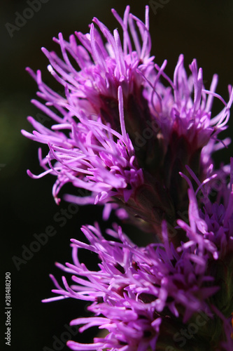 Abstract image of the bright purple flowers of Liatris spicata 'Kobold', backlit and in extreme close up.