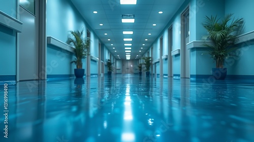 Abstract interior of a modern hospital corridor, blurred background, healthcare facility setting