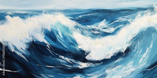 Abstract landscape, oil painting, swirling blues and whites, mountainous terrain, glacial peaks, dynamic brushstrokes, atmospheric, ethereal, cool color palette, textured canvas, impressionistic style