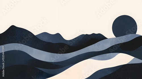 mountain, moon, abstract, landscape, layer, wave, dark blue, artistic, silhouette, minimalist